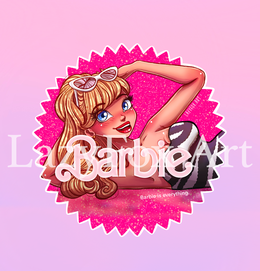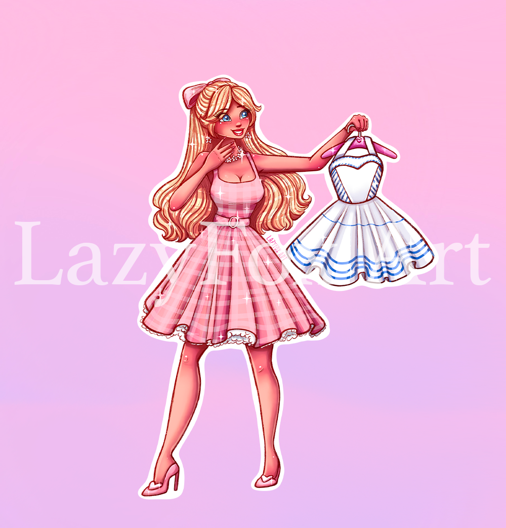 Barbie outfit sticker is 10cm tall and printed on gloss finish ticker paper with a metallic shine!
